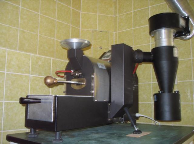 I bought this roaster from a friend in the Netherlands in the summer of 2009. It had been used for a couple of years and the heater had been replaced. In addition, the analog-clock style mechanical thermostat had been replaced by a digital Omron E5EN temperature controller and thermocouple. In the first 18 months that I have owned it I have roasted more than 100 pounds of coffee in about 150 roasts. Although the roaster is capable of roasting 400g batches I have often roasted smaller amounts. General Description The Maggiolino is an electrically heated, drum-type manual roaster with only a mains switch and a temperature controller. There are no other controls and there are no safety devices built into the machine. A cyclone-type chaff collector is included, powered by a centrifugal blower that also helps control the roasting temperature and cools the beans when roasting is finished. Roasting 400 grams of coffee creates a large amount of smoke, making it necessary to vent the roaster to a chimney or at least outside the house. The blower has a 100 mm diameter exhaust to which a standard smoke pipe or flex-hose can be attached. Pre-heating the roaster takes about 10 minutes and a 400g roast takes about 16 minutes. Continuous, back-to-back roasting without pause is possible, allowing one to roast about 3 pounds of green beans per hour. The drum is 150 mm in diameter and 21cm long. It is non-perforated with large welded spiral fins and is made of very heavy carbon steel. It is supported by a 15 mm welded steel shaft that runs through it, turning on ball bearings front and rear. The drum is welded into a heavy carbon steel cage and is not removable. It is driven by a large, geared electric motor and rotates at 34 rpm. The thermocouple is mounted in the front plate and extends into the drum so that it is above the bean mass, but constantly being hit by the falling beans. The temperature controller is set by pressing buttons with rotating drum-type indicators. The temperature can be set from 0° to 300°, but due to the inherrent inertia of the design, the thermocouple and the heating element the system tends to oscillate rather dramatically. This cycling must be taken into account when starting a roast, as will be seen in the description of the process later on. The whole roaster is 66 cm long, 50 cm wide (with attached cyclone) and 46 cm high. It weighs 27 kg (about 60 US pounds). Note: In some of the pictures you will see a webcam aimed at the temperature display. This serves as an input for the very useful and genius program "OCR Roast Logger" written by GreenBean of Too Much Coffee. For a tear-down slide show of the roaster click on the picture below. Then press the Autoplay arrow at the top right.