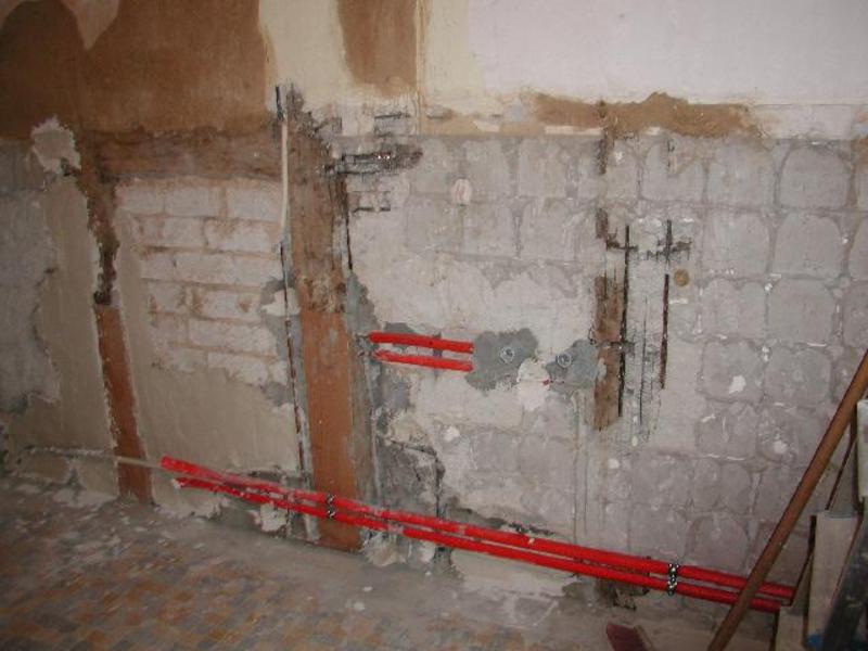 The bathroom had been divided into boys and girls toilets so the middle wall had to be removed and a new door frame constructed. Here, too, the walls and beams in the walls had been damaged by leaking water pipes and beams had to be replaced and walls rebuilt.